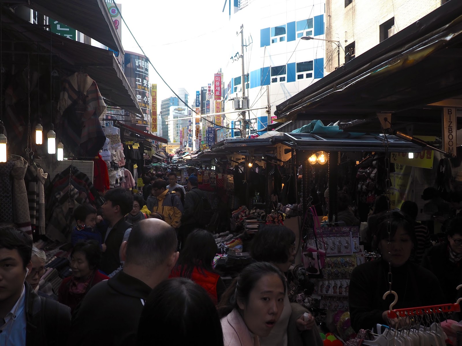 After this, we went to look around Namdaemun Market. I didn’t get anymore presents here, as it wasn’t really the sort of thing I was looking for, but it was fun to wander around for a while. It’s a proper market of stalls (as oppose to our Insadong shopping, which is actual shops, not a market), which seems to sell everything. There were lots of clothing stalls, but I also saw many accessories, children’s toys, homeware, and food carts. And these stalls were loaded, almost groaning under the weight of the sheer amount of goods piled on to each one. The streets were crowded too, mostly with locals, and it was probably busy being a Sunday. It was interesting, but all of it was average day-to-day goods, that you could get anywhere, so not what I was looking for as gifts. We went down a side street full of small restaurants, so we stopped at one of these for a late lunch.