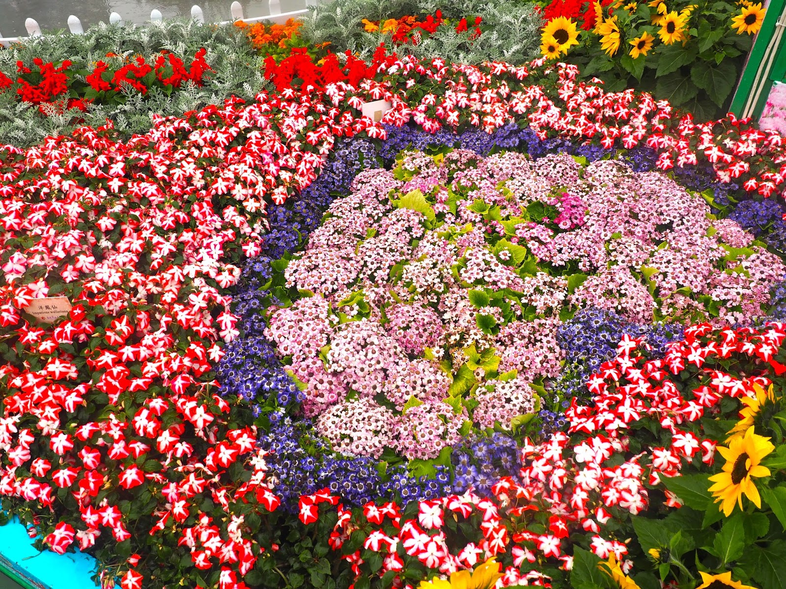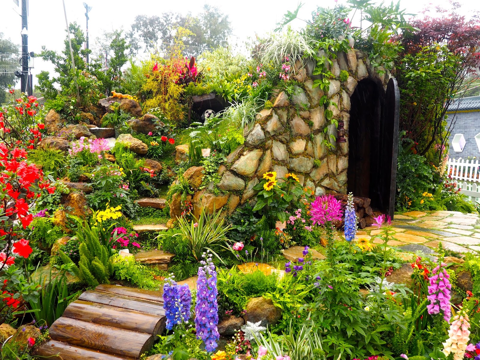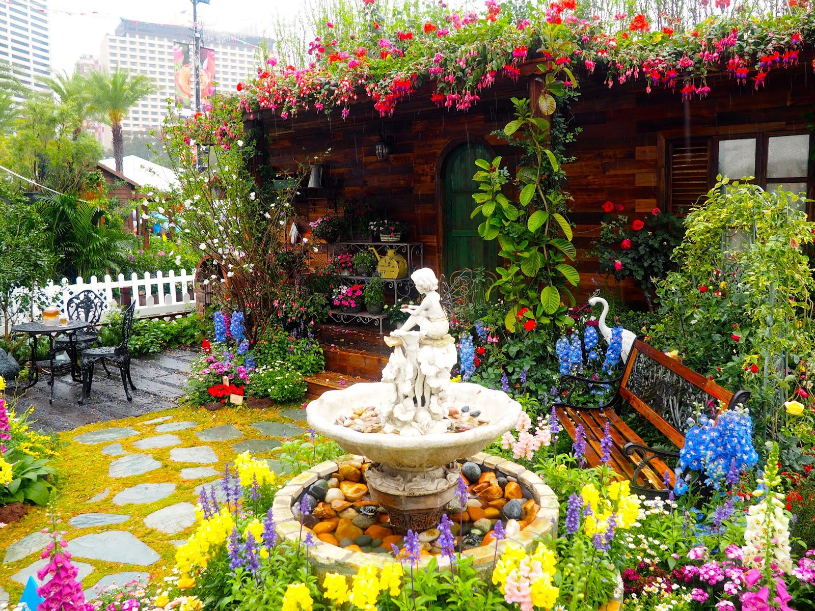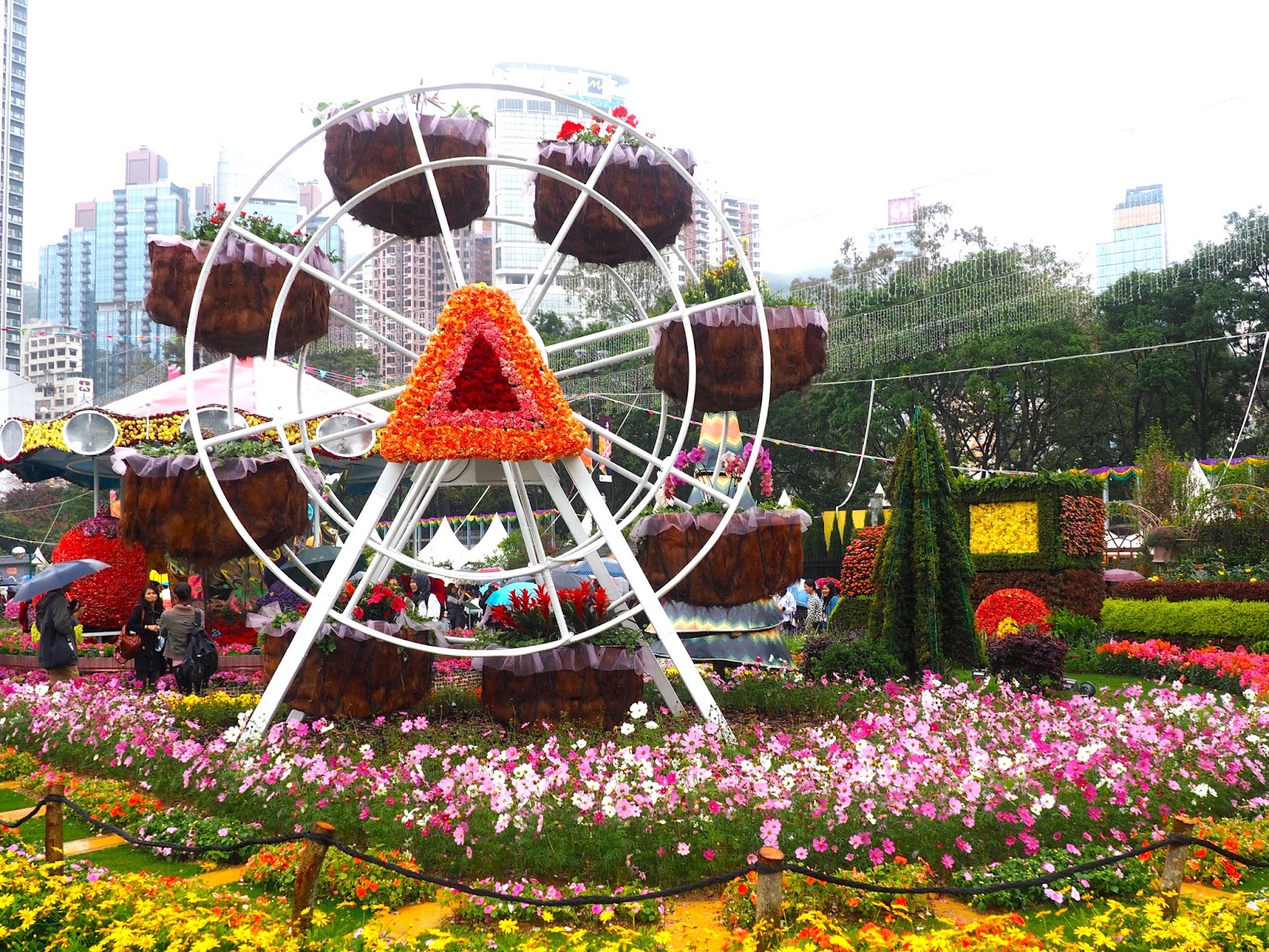 There was also a group of displays created to be small gardens, rather than art exhibitions, each entered by one of Hong Kong’s districts, with a sign to explain which district it was from, and the story or theme behind it. Some featured traditional Chinese structures as part of them, while others had more Western themes. The hobbit-like hole was one that stood out to me, and happened to be from Sham Shui Po, where I currently live! Another area nearby had a floral fairground, with a ferris wheel and carousel adorned in flowers, and there were various garden furniture pieces around too, like the large pagodas, tunnels, bridges and even a carriage. Several displays had water features too, including fountains, mist, and a pond with tall towers supporting colourful glass plates positioned in the water.