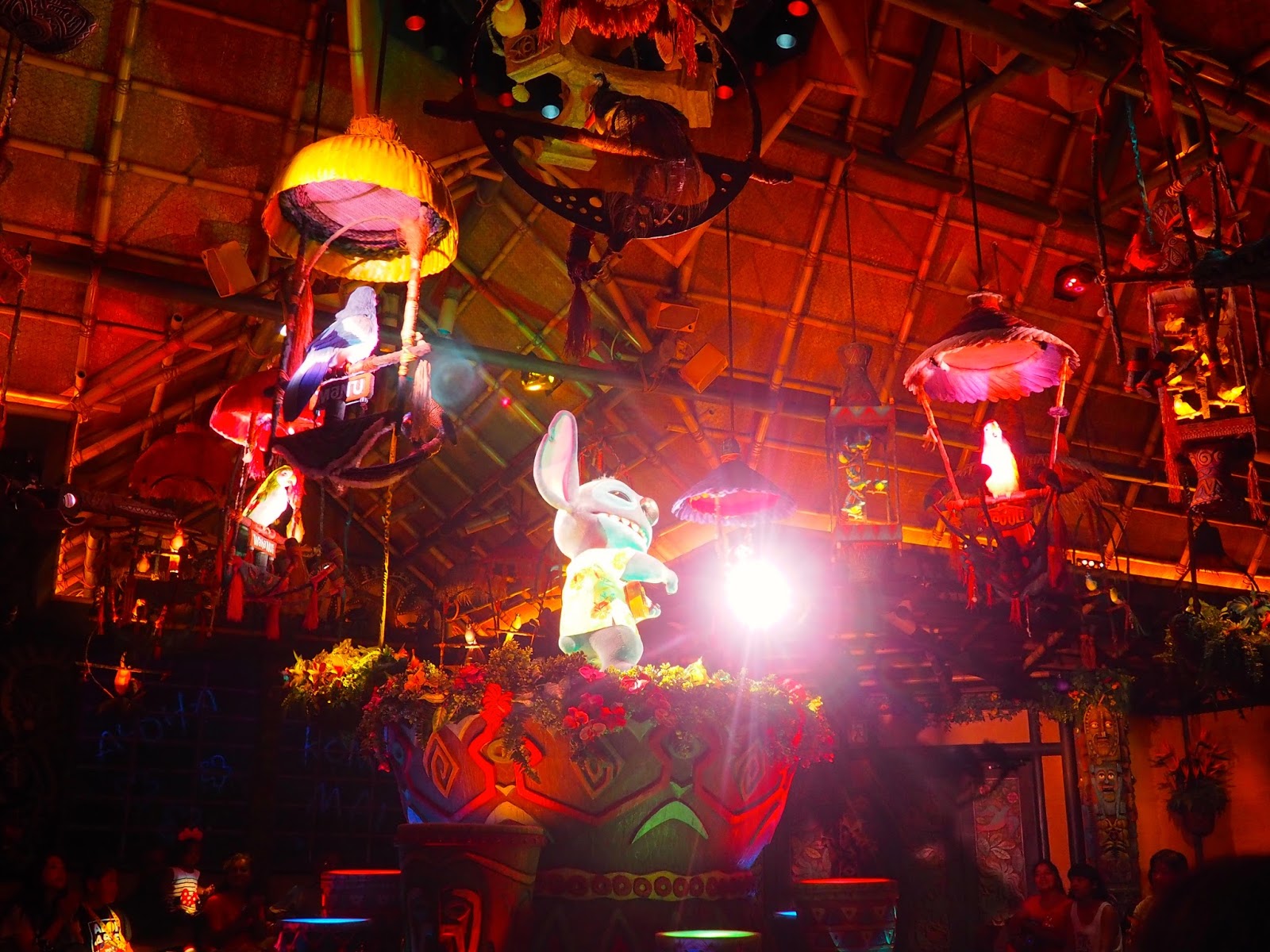I jumped on the Western River Railroad next, a steam train that circles through Adventureland, Westernland, and Critter Country, including both the rivers in these areas. It was raised high, so there were good views of the rest of the park, but also a few scenes set up along the way, only visible from the train. There was commentary about the scenes too, but only in Japanese – this park had more English options than Shanghai did, especially as many of the characters still spoke English, and most songs weren’t translated, but there were still times when it was Japanese only. The scenes were mainly Western in theme, including deer, railway towns, and Native American camps. Then I did the Jungle Cruise, another ride familiar from other parks, but always enjoyable. Again, Japanese only, so I didn’t understand the jokes, but I still love seeing the detail in all the animatronic animal scenes, including gorillas trashing the camp, elephants playing in the waterfall, and snakes emerging from ancient ruins. My last stop in Adventureland was The Enchanted Tiki Room, a short show featuring Stitch. I’d read mixed opinions of it online, but I adore Stitch, so I wanted to check it out. I could loosely follow the plot; you entered to watch a musical performance put on my birds and singing flowers (all animatronics), but it gets interrupted by Stitch, who wants to join in, and eventually he emerges in the centre with his ukelele. It used songs from Lilo and Stitch, but translated into Japanese, as was all the dialogue. It was definitely a more unusual show, but I enjoyed it anyway, and it only lasts about 10 minutes.