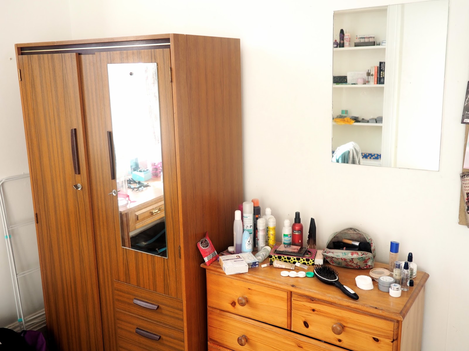 I haven’t brought up most of my posters, frames, and other wall art so far – as I said, I’ve been a bit lazy about decorating the room at the moment, and they aren’t the easiest items to transport – but I did eventually fill up the pin board just inside the door last week. The centre piece is actually the dust jacket from ‘Turtles All the Way Down’, by John Green, which unfolds into a quotation poster on the inside. The other items include Fringe flyers, postcards, Chinese New Year red packets, tickets and wristbands, and other cards and prints I had lying around. Next to that is the mirror, so I’ve used the chest of drawers to put all my hair, makeup, and other cosmetic items. I didn’t try to tidy this up much for these photos, as I think the internet has enough ‘picture perfect’ rooms as is; this is more authentic, as I use this stuff everyday and don’t actively try to keep it neat. The drawers and wardrobe have all my clothes in them, and I like that the wardrobe has a second mirror, which is better for viewing outfits in full.