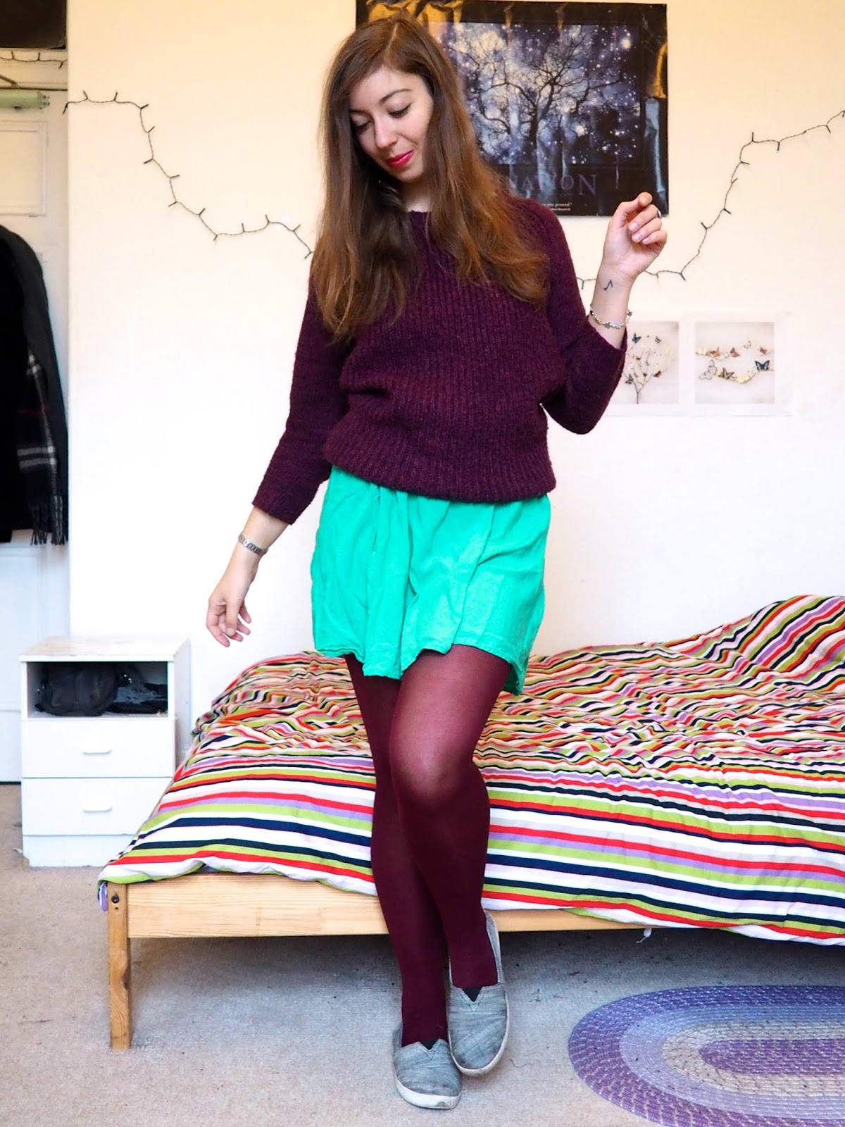 This week’s Disneybound outfit is courtesy of a classic princess, Ariel, from ‘The Little Mermaid’ – check out my Ursula outfit here. There’s a few outfit options for her, since she wears several dresses in human form, but I decided to create a look inspired by her mermaid style. However, I swapped out her normal summery style, for something more winter appropriate, for a different take on her look. I wore this bright green dress, with a thick purple jumper on top, to match her colour scheme. I recently got these burgundy tights too, so I thought they would match the style, though Ariel’s shade of purple is slightly different to this. I chose my grey Toms shoes, as they’re subtle and simple – since if it were summer, I’d have done sandals or bare feet instead. For jewellery, there’s a blue ring and starfish bracelet for her ocean home, and these turquoise earrings, hitting a shade somewhere between her tail and the sea. Finally, I added a tiny bit of shimmer eyeshadow, and a pink lipstick, and kept my hair loose and natural.