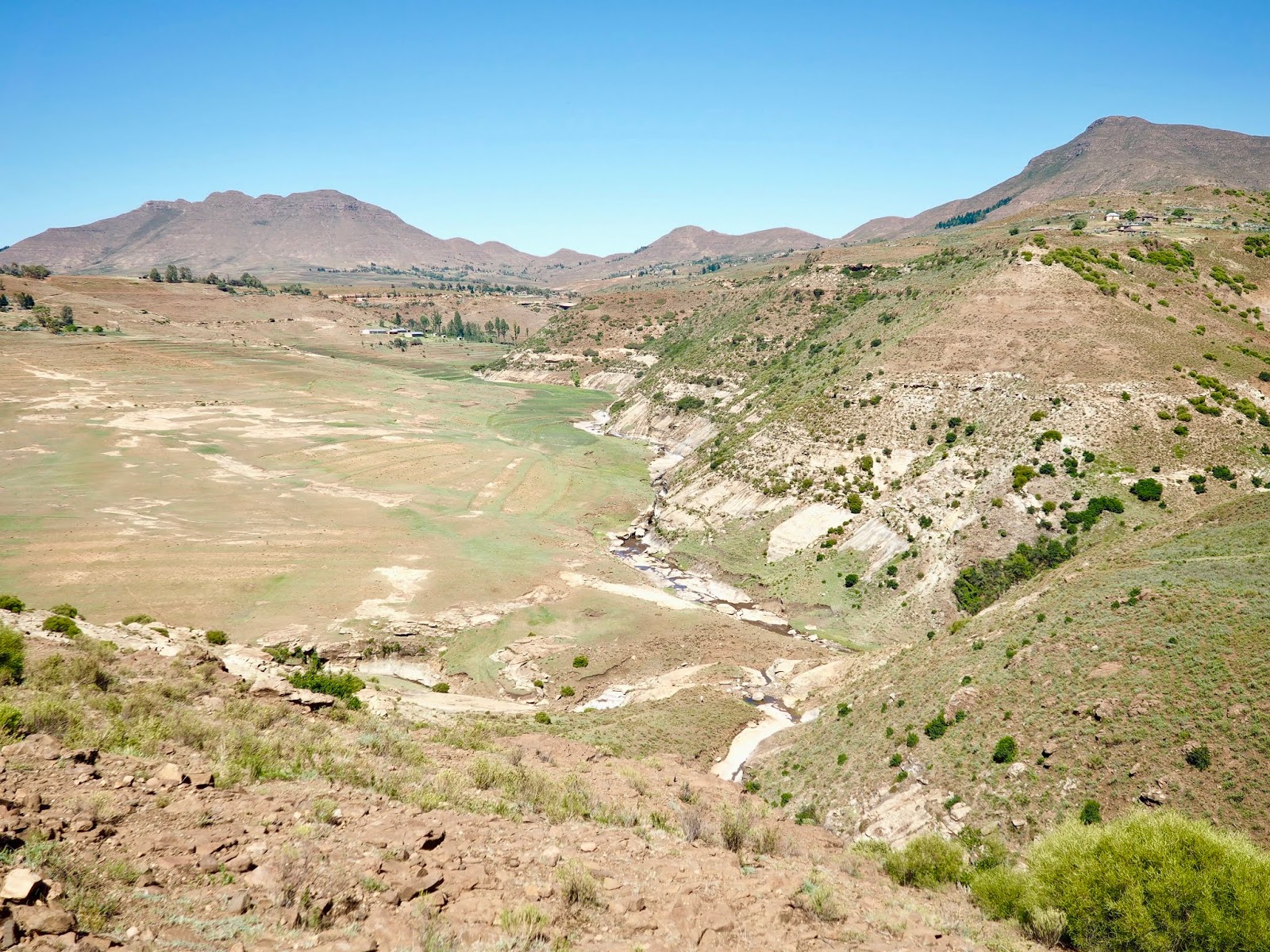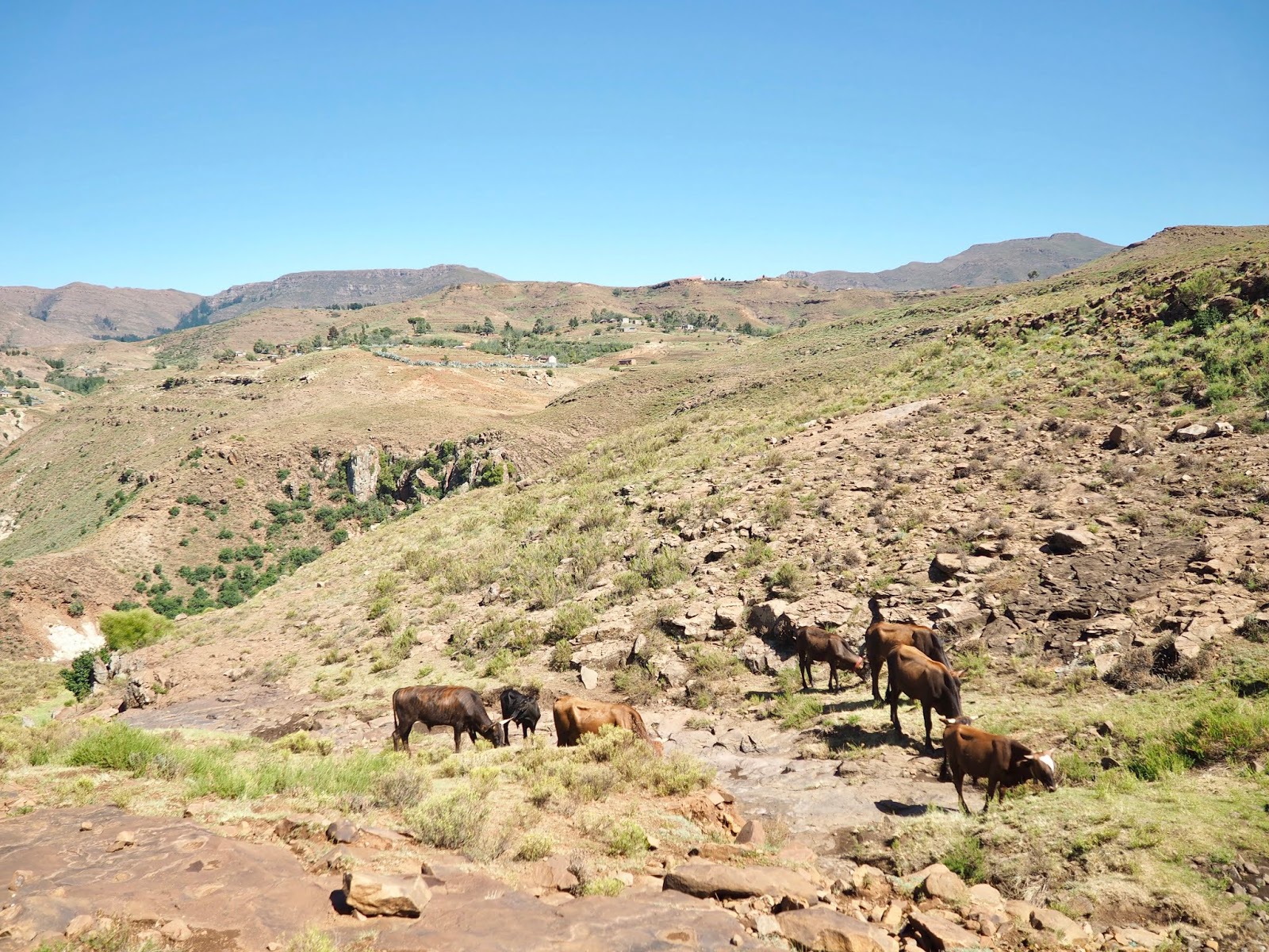 We weren’t staying in the city though, so our drive continued into the countryside, through those vast mountain ranges, and dry, dusty valleys in between. There was lots of farmland though, as we passed dozens of people tending to their crops and animals. The roads were pretty rough going at times, with bumpy dirt tracks, and narrow twists and turns through the mountains. Eventually, we arrived at our accommodation late in the afternoon, at the Malealea Lodge, next to a tiny village. It turned out that many of the villagers are employed by the lodge now.