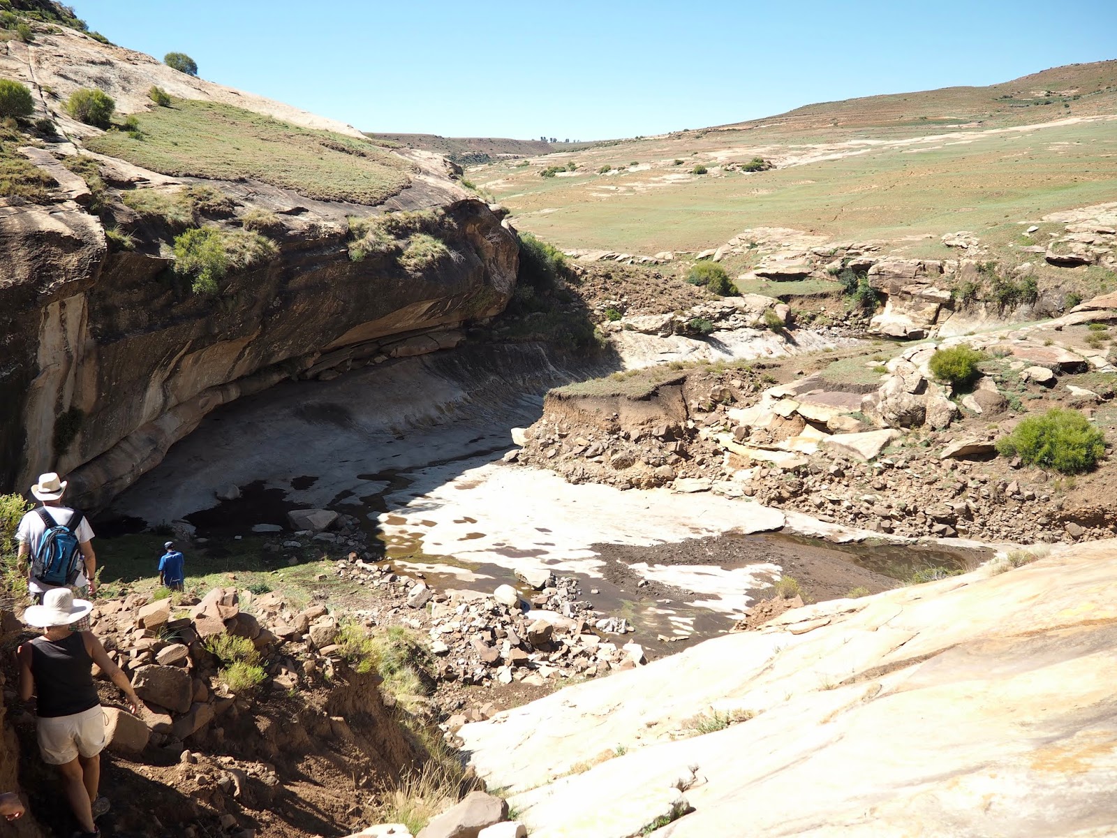 Once we’d had our fill of the water, it was time to make our way out of the gorge again. I did say this was an unusual hike, as we were basically going in reverse, having to climb uphill to return to the lodge. And when I say uphill, I do mean up. It was a near vertical climb up the rocks, probably even harder than the scramble we’d done in Drakensberg! Especially under the hot sun, and after already walking quite a bit. It was tough going and required many breaks, but our efforts were rewarded at the top with views over the gorge and the surrounding landscapes, the flat valleys and distant mountains, huge rock formations painted in shades of brown and yellow, dry and dusty in the summer heat, but dotted with green foliage in places. Then it was back through fields and farmland again, though it was a circular route, so not the same ones we’d come through earlier, until we eventually returned to the lodge.