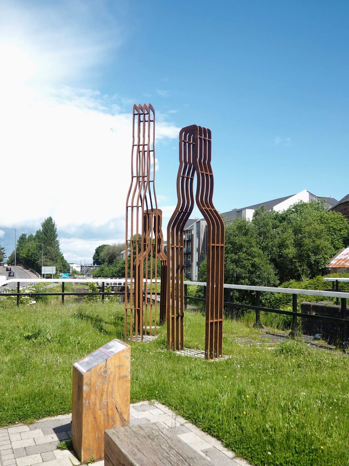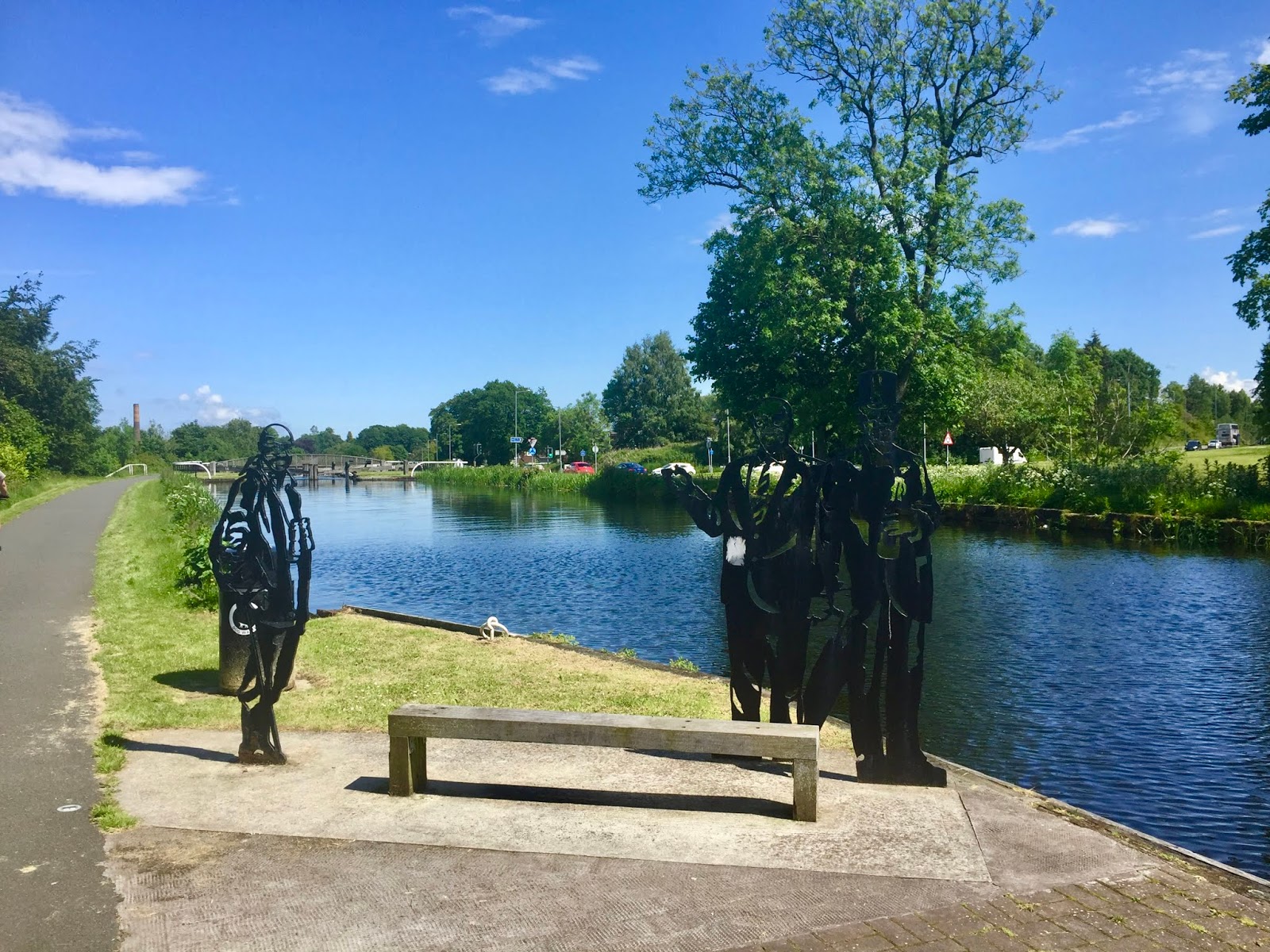 The internet told me it would take about an hour and 20 minutes to reach the Kelpies, which was pretty accurate. It’s a very pleasant walk, alongside the water under the sunshine! Along the way, there are a couple of points to look out for, as part of the canal’s ‘#Wheel2Kelpies selfie trail’. We don’t take many selfies, but these points taught us a little more about the region than we might have known otherwise. One had figures of famous people from Falkirk, including the guy who invented Irn-Bru – what a legend! – and another indicated an old distillery site, that the canal company plans to redevelop soon. We also passed plenty more locks in the canal, and saw quite a few swans along the way