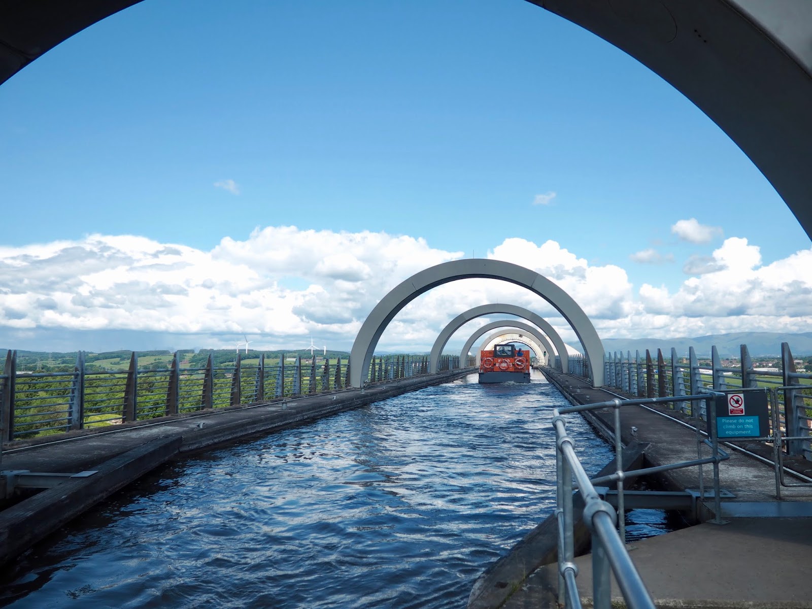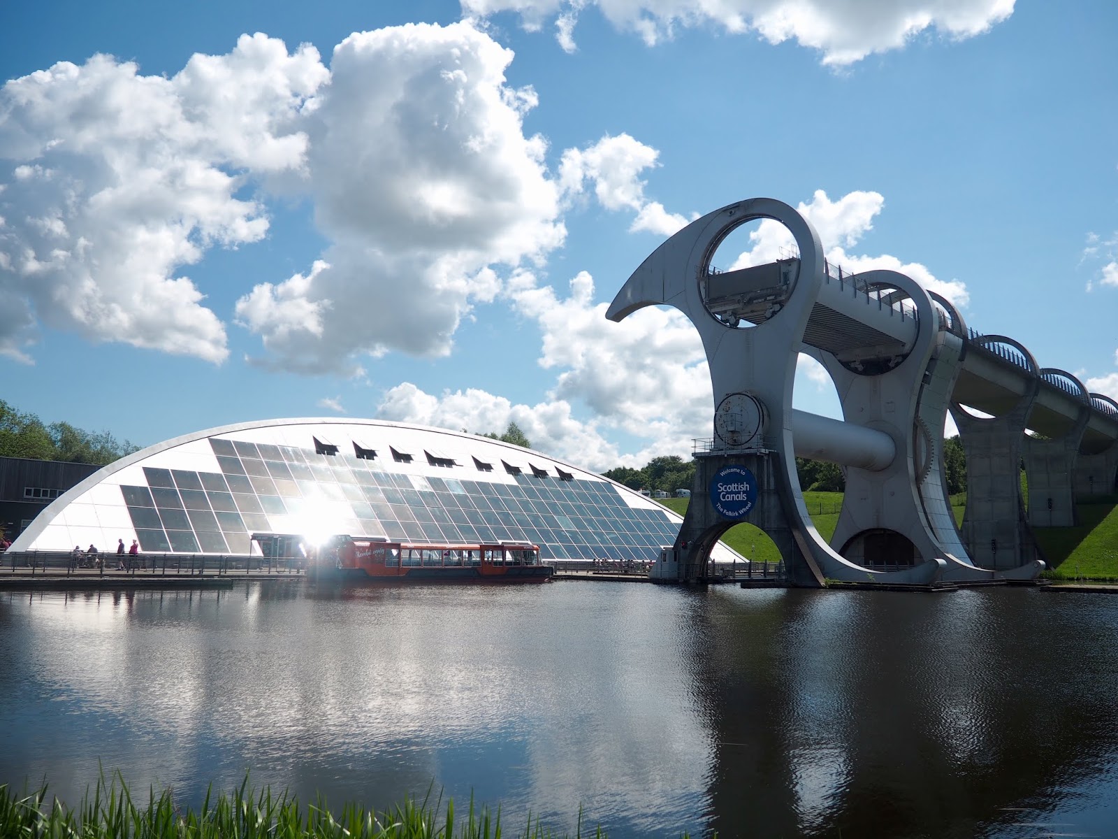 We soon reached a few locks in the canal, which descended down to the Falkirk Tunnel, the longest canal tunnel in Scotland. It’s very dark inside, with light coming in faintly from either end. It turned out that it’s very close to the Antonine Wall, from the Roman era, but we didn’t take the path to see that as we didn’t realise this until later on. Instead, we continued straight on towards the Falkirk Wheel. The Union Canal is the upper section, with the Forth & Clyde down below. The Wheel is kind of what it sounds like, a giant wheel that connects the two canals to allow boats to pass from one to the other. We both agreed it’s a little like a ferris wheel, but with only two ‘carriages’, so two boats can switch places at the same time. It is the world’s first, and currently only, rotating boat lift, and is a fairly new addition to the area, built in 2002. We arrived just in time to see it turning, but it is very slow – even taking a video on time-lapse mode, it still looks slow!
