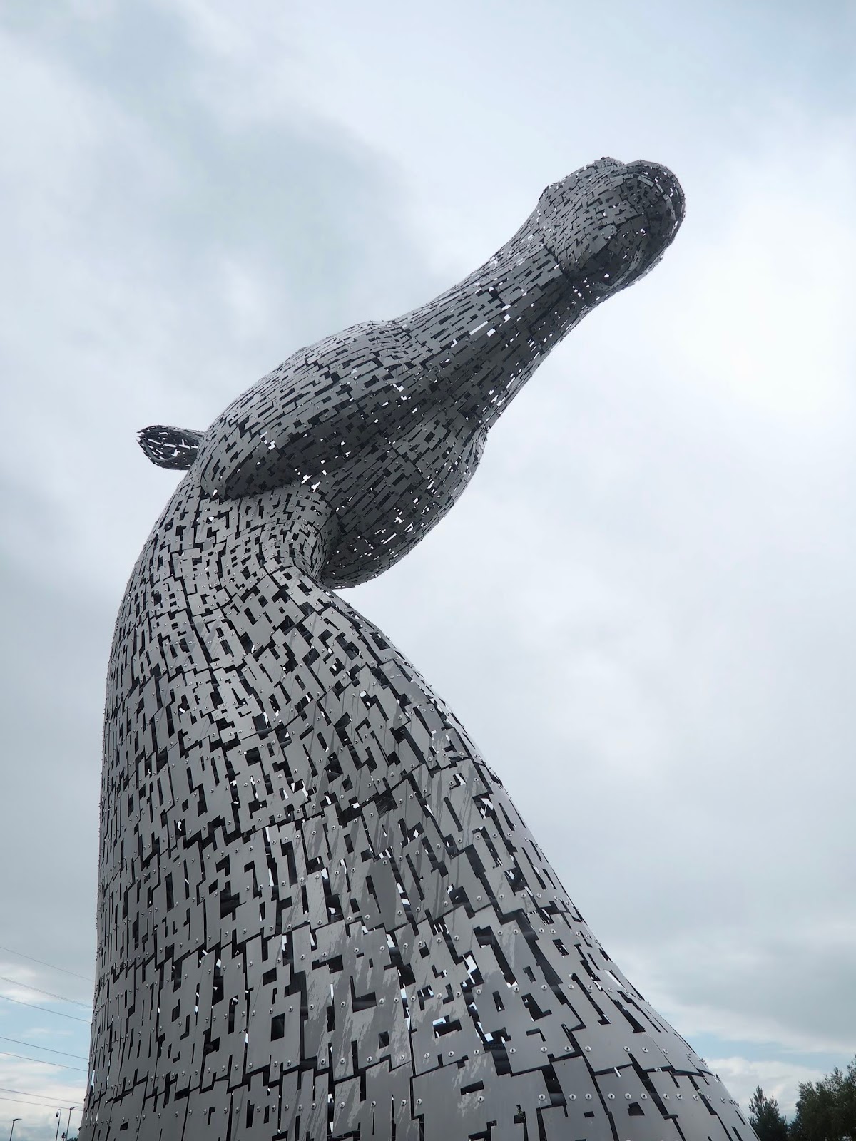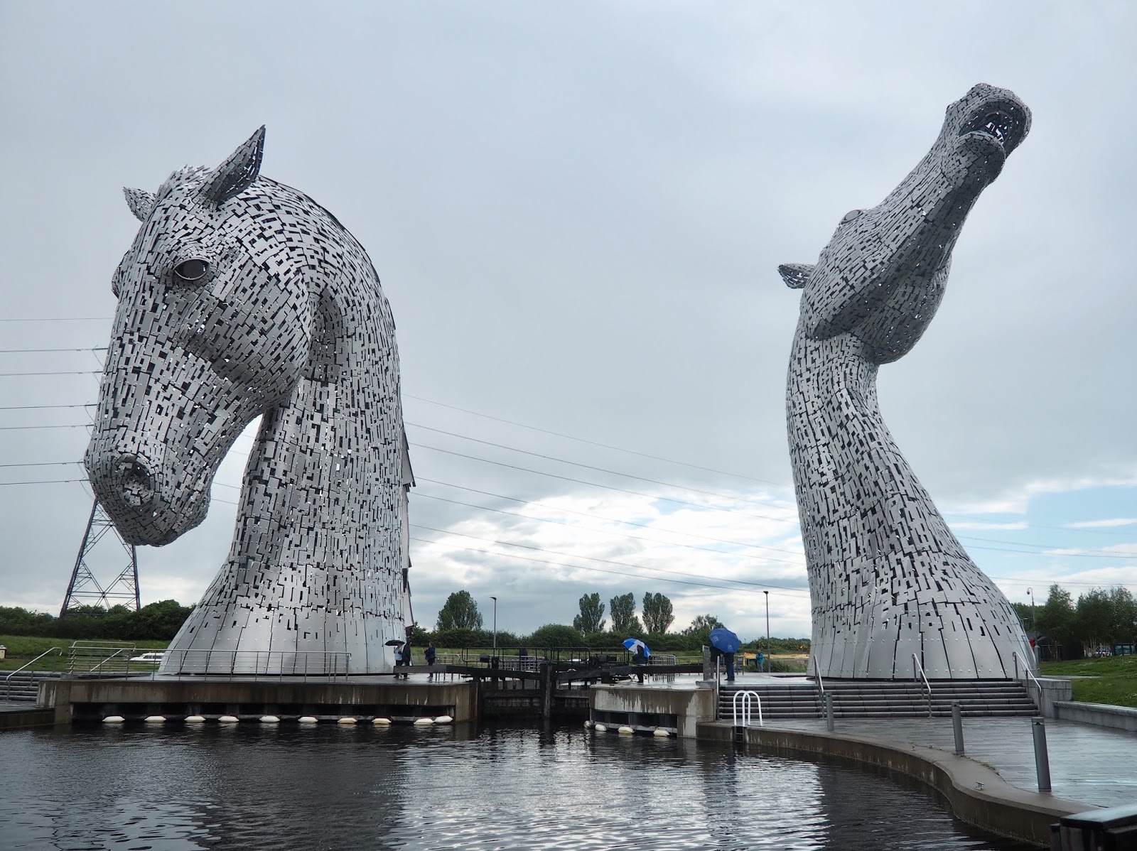 As we got closer to our destination, the sun started to disappear behind thick, grey clouds. By the time we arrived, it started pouring with rain so we quickly dashed into the visitor centre next to the Kelpies for a cup of tea while we waited it out. It was nice to take a break anyway, and we could sit and look at the Kelpies in the mean time anyway. These are two, 30m tall, horse head sculptures, installed in 2013, the world’s largest equine sculptures. They are to commemorate the role of horses in Scotland’s heritage and industry, who would have pulled the boats along the canal, amongst other jobs in various industries. The name ‘kelpies’ refers to mythological creatures of Scottish folklore, half horse and half sea serpent creatures, who live in the lochs and shape shift into horses on dry land.